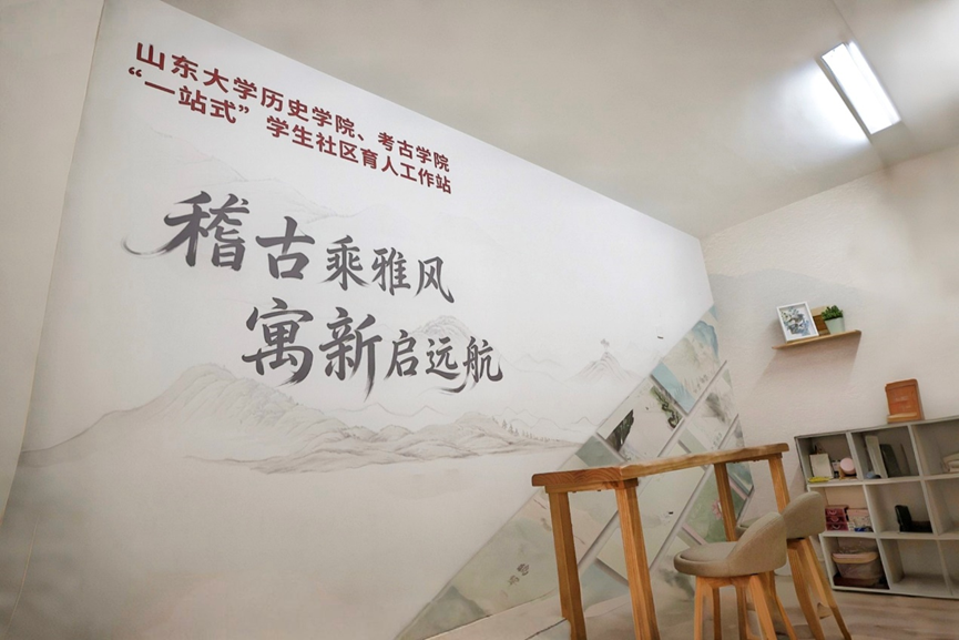 为深入贯彻落实立德树人根本要求,历史学院、考古学院秉持“知古鉴今,崇实求新”育人理念,拓展“思政引领、文化塑品、专业融合、实践拓展”文化育人体系,将学生公寓生活圈转化为浸润式育人空间,在学生宿舍3号楼建成并启用“稽古寓新”学生社区文化育人工作站。工作站立足学生社区生活场景,激发文化创造创新活力,以学院研究生“文化中国”两创大赛全国总决赛亚军作品“鹊华新声”为设计元素,活化历史名图《鹊华秋色图》,实现中华传统文化、济南历史文化与学生楼宇空间的深度对话,构建可感知、可参与、可传承的沉浸育人场域,为培育兼具文化自信与时代担当的高素质人才夯基筑石。